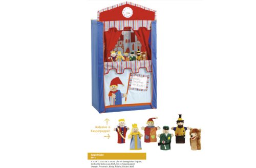 Puppet Theatre wit 6 PuppetsDimensions: 120 x 66 x 39 cm Consists of a solid wooden frame and printed scenery on fabric.With 6 puppets: PunchPrincessKingPolicemanRobber And Wolf