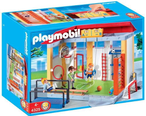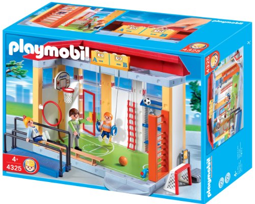 Playmobil School Gym 4325Stay active and get some exercise in the School Gym. Includes three figures, gym with basketball hoop, gymnastic rings and bars, soccer goal, and other accessories. You can even keep score with the manual scoreboard. Dimensio...
