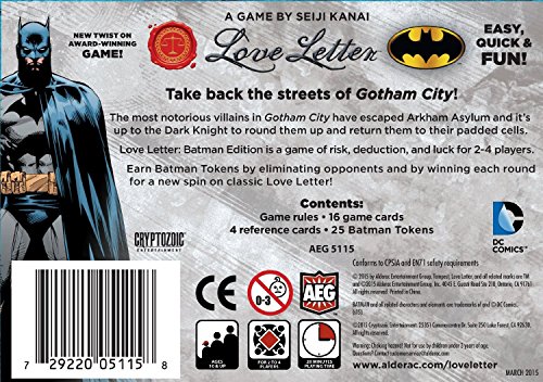 Take Back the Streets of Gotham City! The most notorious villains in Gotham City have escaped Arkham Asylum and itâ€TMs up to the Dark Knight to round them up and return them to their padded cells. Love Letter: Batman Edition is a game of risk, de...