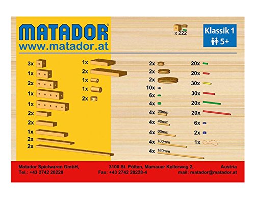 Description:Nothing is as important for the healthy development of children as lively, unhampered play. This is exactly the kind of play that the Matador Klassik 1 set encourages. Small building blocks are complemented by wheels, axles, pulleys, hubs...